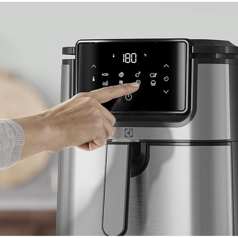 La Freidora Independiente 4 L 1500 W Negro/Acero Inoxidable de Aire Caliente Electrolux E6AF1-4ST cuenta con una capacidad de 4 litros, adecuada para la preparación de diversas porciones de alimentos. Su potencia es de 1500 W, lo que permite un rendimiento eficiente en el proceso de cocción. Este equipo utiliza el sistema de aire caliente, lo que facilita la fritura de alimentos con una menor cantidad de aceite en comparación con las freidoras tradicionales. La freidora está equipada con controles de temperatura ajustables, que permiten seleccionar el nivel de calor deseado según el tipo de alimento que se cocine. También incluye un temporizador que avisa cuando el tiempo de cocción ha finalizado. El material principal de la carcasa es acero inoxidable, diseñado para facilitar su limpieza y mantenimiento. La freidora incorpora una cesta extraíble que permite un manejo y limpieza más sencillos. Compatible con varios tipos de recetas, este aparato ofrece la posibilidad de preparar alimentos como papas fritas, pollo o vegetales. Dispone de un sistema de seguridad que apaga el aparato si se presenta un sobrecalentamiento. La base del dispositivo está diseñada para proporcionar estabilidad durante su uso. Esta freidora requiere conexión a una fuente de alimentación eléctrica estándar para su funcionamiento.