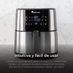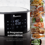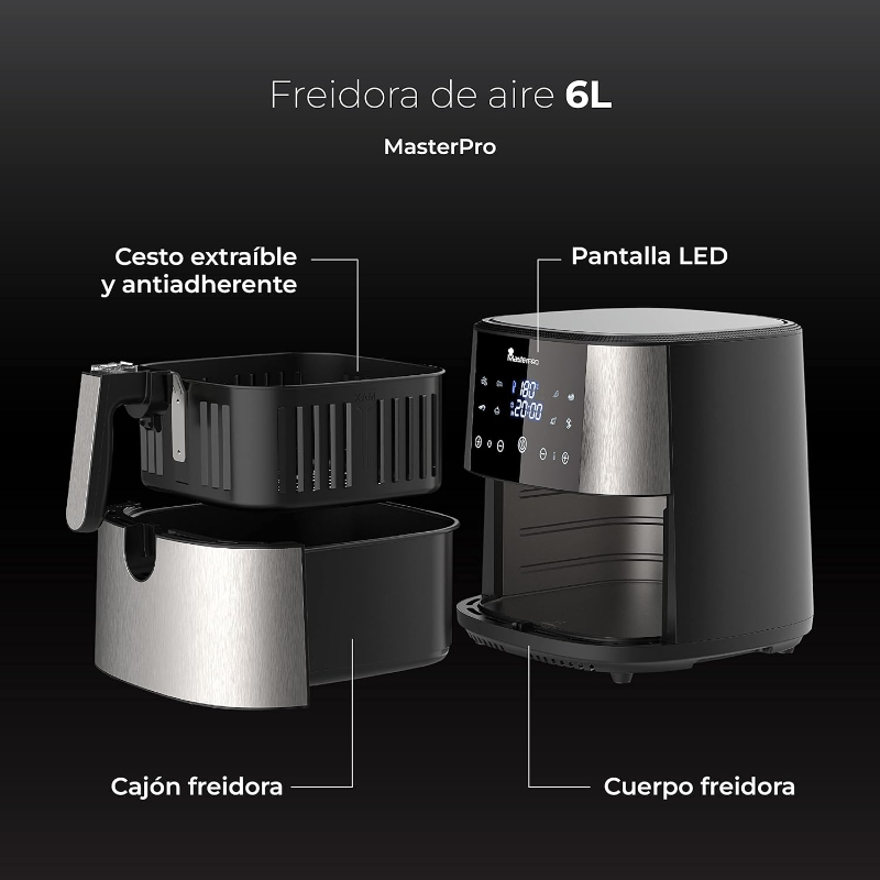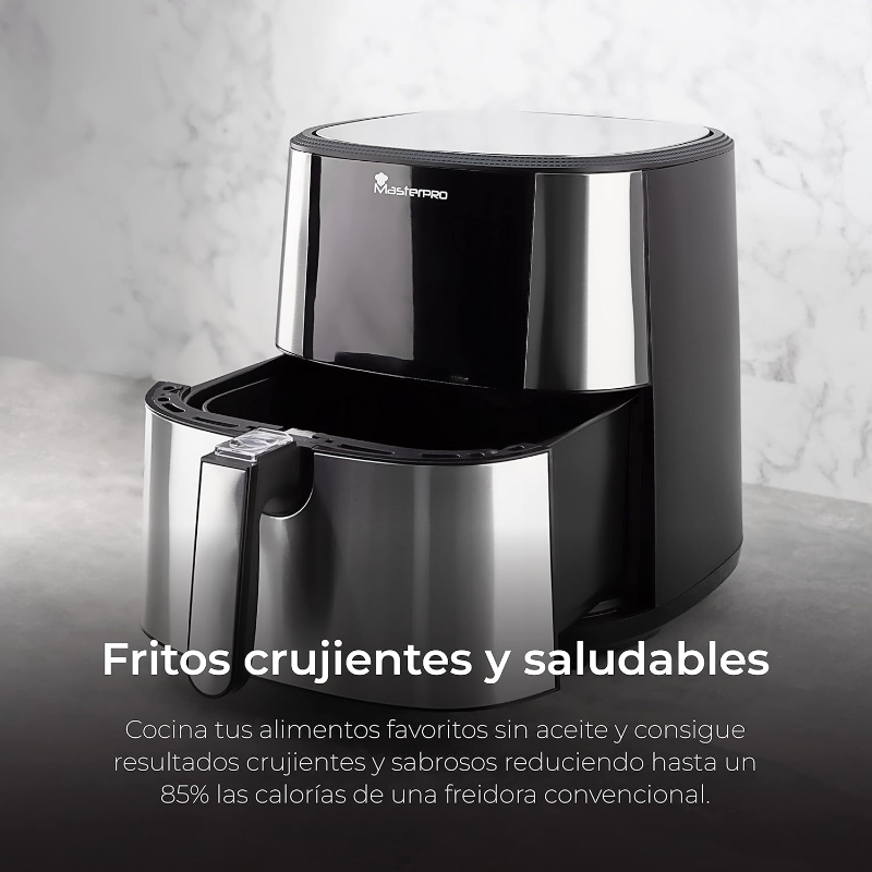 La Freidora 6 L sin Aceite 1800 W de Masterpro está diseñada para cocinar alimentos utilizando aire caliente en lugar de aceite, lo que permite la preparación de comidas con una menor cantidad de grasa. Este dispositivo cuenta con una capacidad de 6 litros, lo que permite cocinar porciones grandes de alimentos simultáneamente. El panel de control digital permite seleccionar entre múltiples funciones de cocción, mientras que su temporizador integrado facilita el seguimiento del tiempo de cocción. Además, incluye un sistema de temperatura regulable que abarca un rango específico, permitiendo adaptarse a distintas recetas. La estructura está fabricada con materiales que son comúnmente utilizados en este tipo de electrodomésticos, facilitando la limpieza y el mantenimiento. La Freidora también presenta una cesta extraíble que permite una manipulación sencilla de los alimentos, así como un sistema de ventilación que asegura una correcta circulación del aire caliente durante el proceso de cocción. Este aparato es adecuado para la preparación de diversos tipos de platos, contribuyendo a una cocina más versátil. Sus dimensiones generales permiten su colocación en diferentes espacios de cocina, lo que proporciona flexibilidad en su uso. Las instrucciones de uso detallan el funcionamiento y cuidado del aparato, garantizando un manejo adecuado desde el primer uso.
