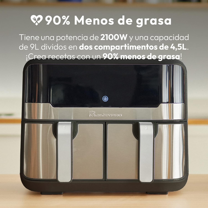 La freidora Masterpro Rocket Duo cuenta con una capacidad de 9 litros y ofrece un sistema de cocción sin aceite, lo que permite preparar alimentos de diferentes tipos. Su potencia alcanza los 2400 W, lo que facilita el calentamiento rápido y la cocción de los ingredientes. Este producto incluye un panel de control digital que permite ajustar la temperatura y el tiempo de cocción. Además, dispone de múltiples funciones, como asar, hornear y gratinar, ampliando las posibilidades culinarias. La freidora está equipada con tecnología de circulación de aire caliente, lo que asegura una distribución uniforme del calor. Incluye una bandeja de cocción extraíble para facilitar la limpieza. La cesta de cocción admite diversos alimentos, logrando una preparación variada. Este aparato está diseñado para ser utilizado en la cocina, integrándose en diferentes tipos de preparaciones de manera eficiente. Es compatible con una variedad de recetas que requieren cocción a alta temperatura. El dispositivo cumple con las normativas de seguridad para aparatos eléctricos y cuenta con un sistema de bloqueo de seguridad. Su construcción permite un uso prolongado en el tiempo.