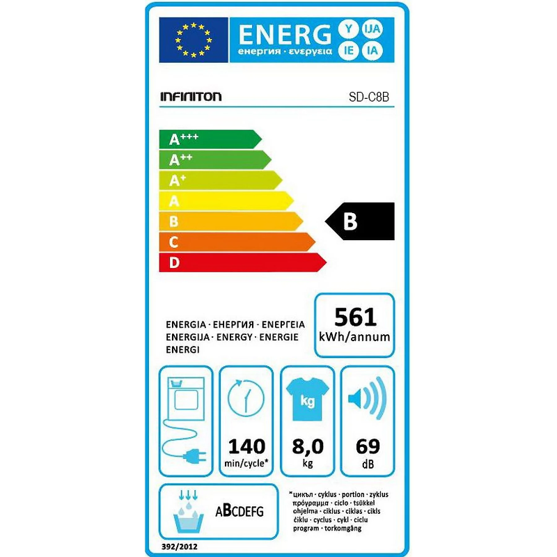 La Infiniton SD-C8B es una secadora de condensación con capacidad nominal de 8 kg. El sistema de condensación utiliza un circuito interno de secado en el que el aire del tambor pasa por un proceso de calentamiento y posterior condensación de la humedad extraída de los tejidos durante el ciclo, sin conducto de evacuación exterior. El aparato se identifica con la referencia SD-C8B y forma parte del catálogo de secadoras de la marca Infiniton. Su función corresponde al secado de prendas textiles que admiten secadora según la etiqueta de cuidado de cada tejido. La capacidad de 8 kg hace referencia a la carga del tambor dentro de los parámetros técnicos indicados por el fabricante para esta secadora.
