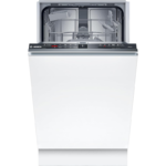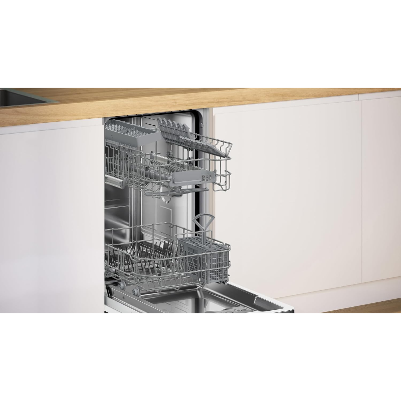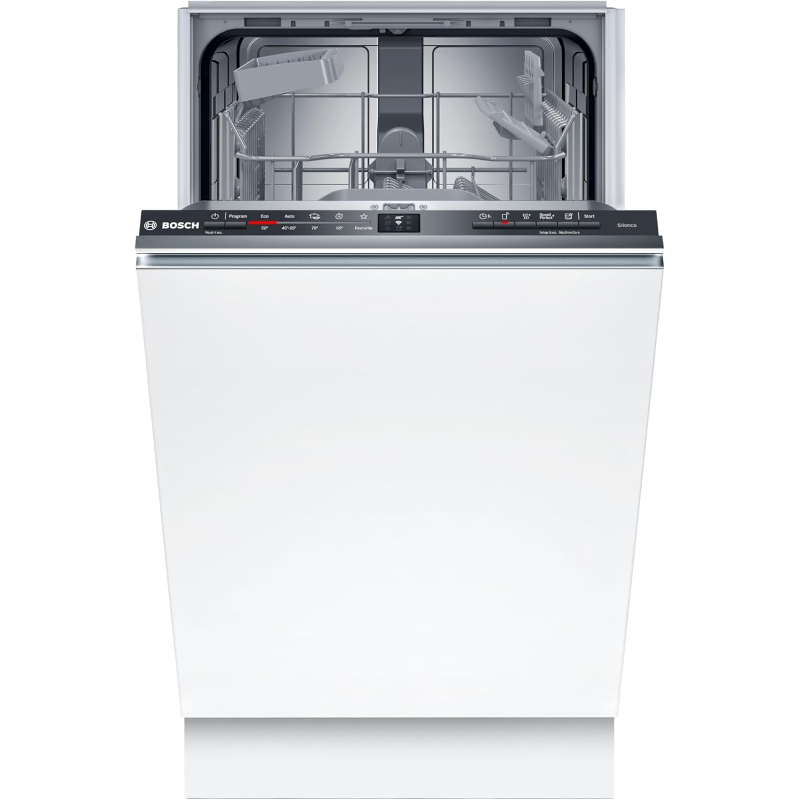 El lavavajillas Bosch SPV2HKX42E es un modelo empotrable e integrable de 45 cm con capacidad para 10 cubiertos. Incorpora conectividad Home Connect para manejo remoto y consulta del estado mediante aplicación móvil. Dispone de 5 programas de lavado. Entre sus elementos figuran motor EcoSilence Drive, sistema AquaStop, indicador InfoLight y programación diferida. El nivel de ruido es de 46 dB y la clase de emisión acústica es C. En el programa Eco, el consumo de agua es de 9,5 litros por ciclo y la duración es de 3 h 40 min. La clase de eficiencia energética es E. La cuba interior es de acero inoxidable e integra cestas para vajilla y cesta para cubiertos. El panel de control queda situado en la parte superior de la puerta y el aparato está diseñado para instalación bajo encimera con frente integrado.