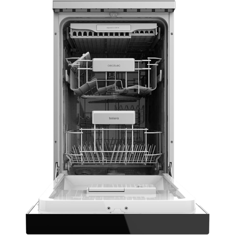 Lavavajillas Cecotec Bolero Aguazero 6100/4201, aparato para lavado automático de vajilla y utensilios compatibles con este tipo de ciclo. La unidad pertenece a la serie Bolero Aguazero de Cecotec y su identificación comercial corresponde al modelo 6100/4201. Integra puerta frontal, cuba de lavado, cestos interiores para la colocación de piezas, brazos aspersores para la distribución de agua, compartimento para detergente y sistema de filtrado en la base de la cuba. El funcionamiento se realiza mediante ciclos programados con fases de entrada de agua, circulación, lavado, aclarado y desagüe. Requiere conexión a la red eléctrica, toma de agua y salida de evacuación. Admite carga de platos, vasos, cubiertos y recipientes aptos para lavavajillas, así como el uso de detergentes formulados para este tipo de aparato. La instalación y la conexión deben realizarse según las especificaciones indicadas por el fabricante para este modelo.