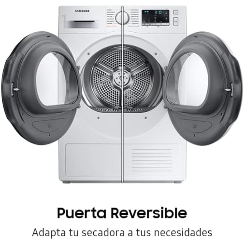 Secadora Samsung DV80TA020TE de carga frontal con sistema de condensación y bomba de calor. Capacidad nominal de secado de 8 kg y clase de eficiencia energética A++. El sistema de bomba de calor utiliza un circuito térmico para calentar el aire del tambor durante el ciclo. Incorpora panel de control electrónico con display para seleccionar programas y ajustar funciones, tambor interior, puerta frontal, filtro y depósito para el agua condensada. Dispone de ciclos de secado automáticos y temporizados, indicación del estado del programa e indicadores de mantenimiento del filtro y del depósito. Formato de instalación independiente y funcionamiento con alimentación eléctrica de red. Uso previsto para el secado de prendas textiles aptas para secadora.